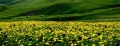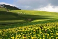在碧蓝的天空下,是如絮如纱的大朵大朵白云,鸟儿叽叽喳喳叫个不停,山鹰在高空盘旋,一群吃饱了巴什拜羊,卧在金莲花从中,悠闲自在。一座座蒙古包和成群的牛、羊构成了一幅幅美丽的画卷,同来的女人们,也陶醉在鲜花绿地间,动情地,边唱边跳起了舞蹈“蓝蓝的天空白云飘,白云下面马儿跑,挥动鞭儿响四方,白鸟齐飞翔......”对摄影师来说,这绝好的瞬间是一定不会错失的。一阵忙碌,停顿下来,才觉得脚底下一阵松软、湿润,然而却不下陷。原来我站在了被绿草遮盖的,细细流趟的泉眼上,下面就是溪流。淌过一片湿地,又挨着一片,有的地方借助凸起草皮,在上面左右跳跃寻找出路。感慨万分,真是名不虚传,孟布拉克的一千多个泉眼一个挨着一个。这里的牧草不仅种类繁多,而且生长茂盛,以禾本科、菊科等优质草为主。受海拔高度的影响,植被长势比山下整整晚了一个月,也正困为如此,我们也才有幸看到这山花烂漫、绿草茵茵的美景。